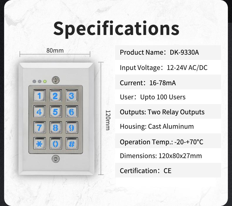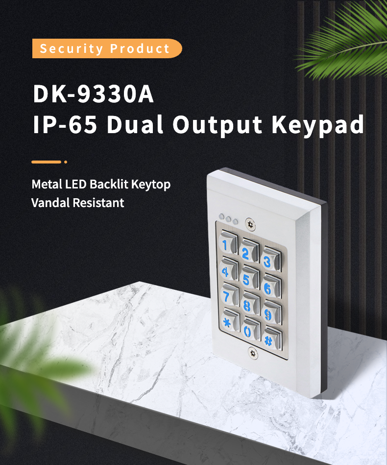 DK-9330 is a vandal resistant simple access control keypad. The keypad has two different modes which Single User Mode and Multi-User Mode. Single User Mode only contains 1 user code. Multi-User Mode contains upto 100 user code.