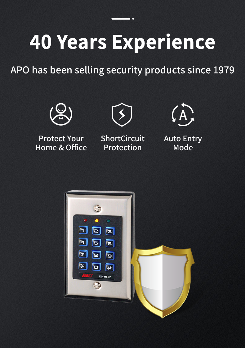 DK-9522 is a simple access control keypad. The keypad has two different modes which Single User Mode and Multi-User Mode. Single User Mode only contains 1 user code. Multi-User Mode contains up to 100 user code.